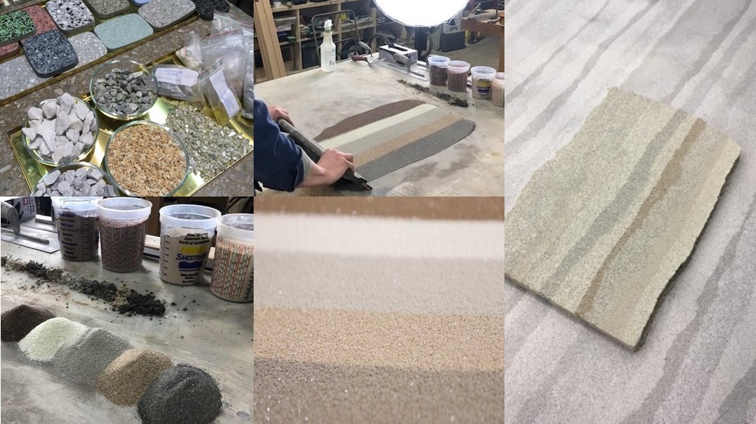 Inspired by rammed earth architecture & terrazzo design making, various sand colors & grains were layered in a loose natural furniture-scale layout.