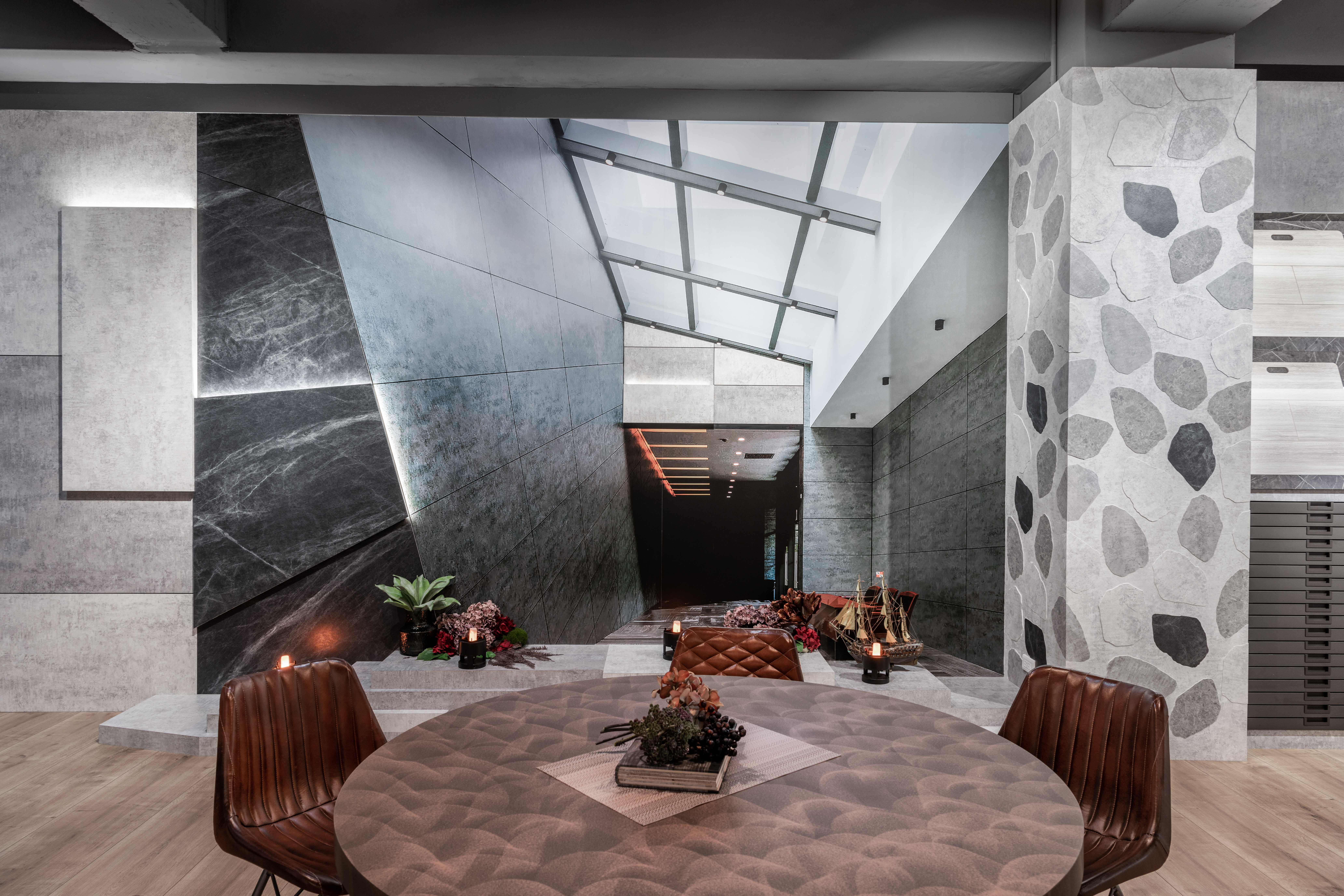 進入展示空間,FENIX®以精品櫥窗的方式呈現眼前。極致霧面、色澤低調且優雅,FENIX®可輕易營造出靜謐的氛圍。 作為精品櫥窗與展示牆,恰如其分的與藝術品相互呼應,讓現代美學在生活中展現獨特的生命力。 現場FENIX®如花般的造型與燈光搭配,展現板材獨特的低光線反射率及令人驚嘆的彎曲性,為裝飾板材帶來的更多可能。